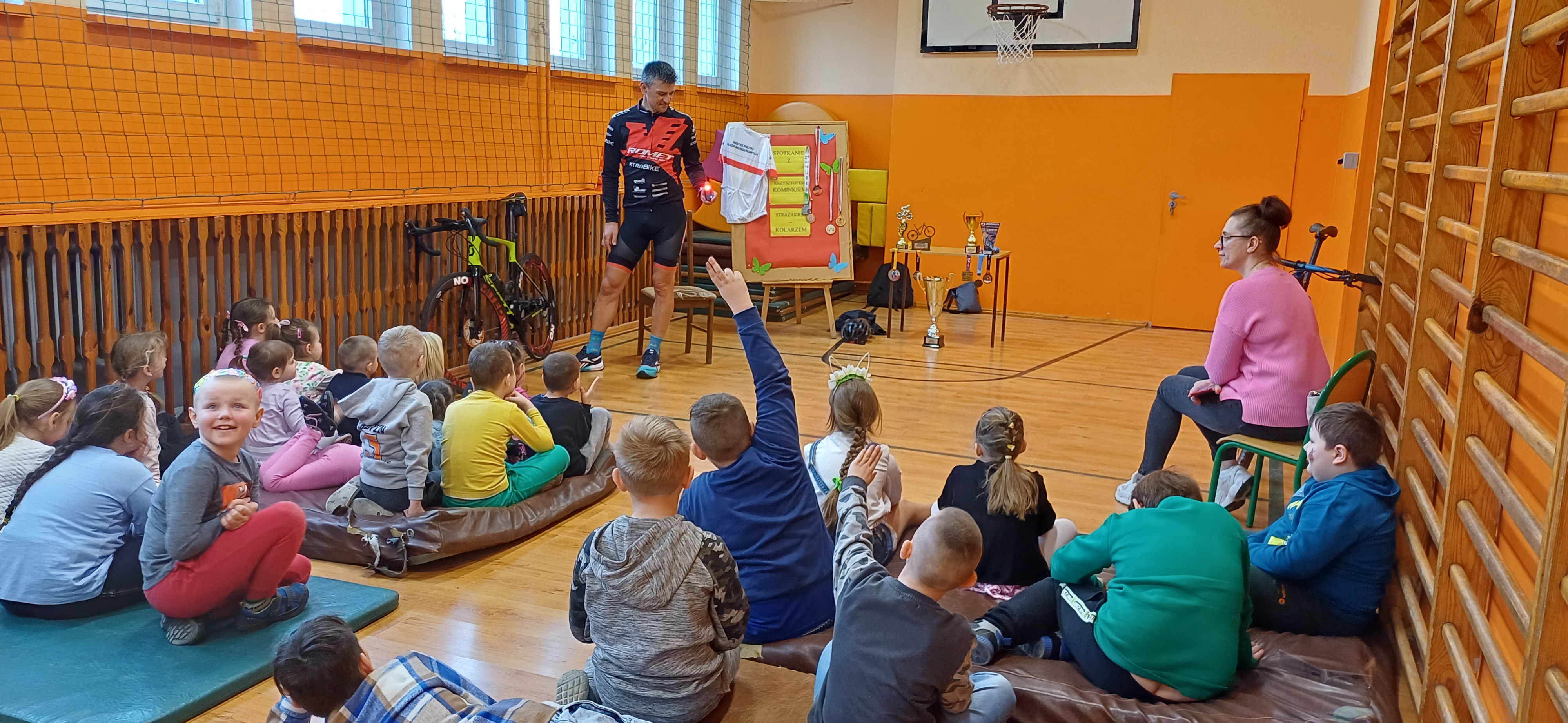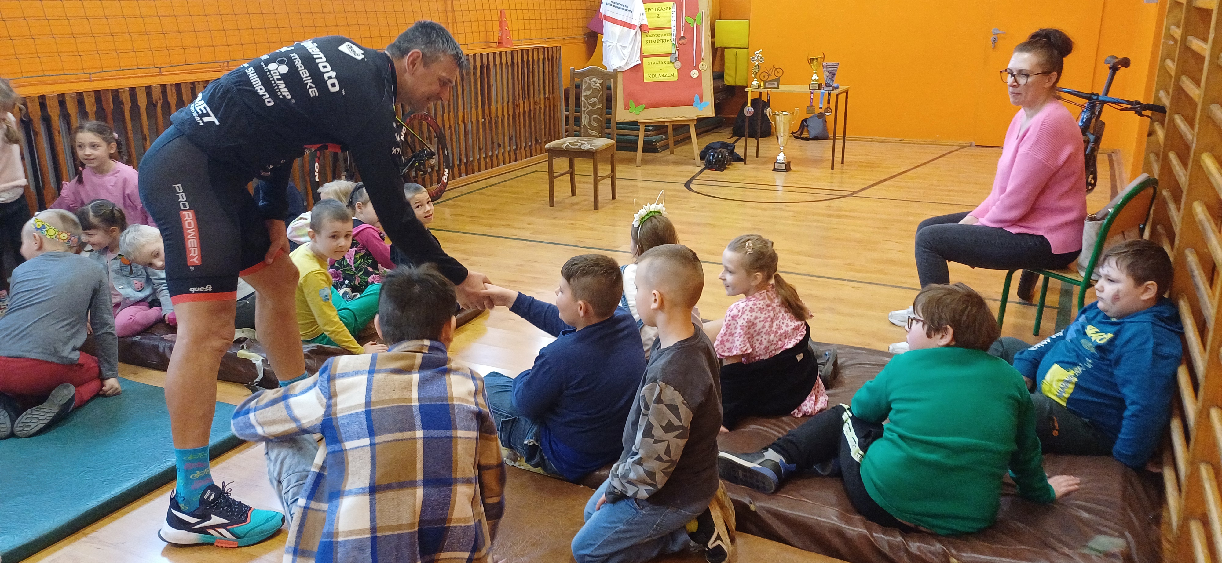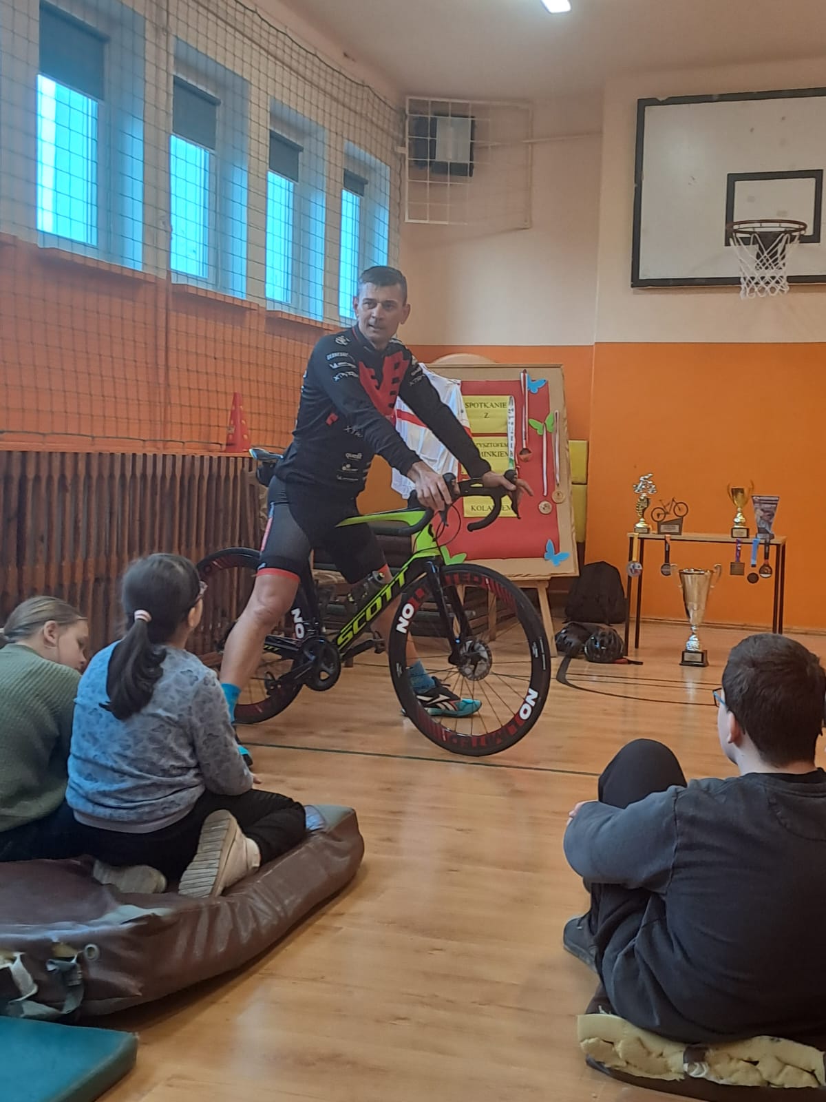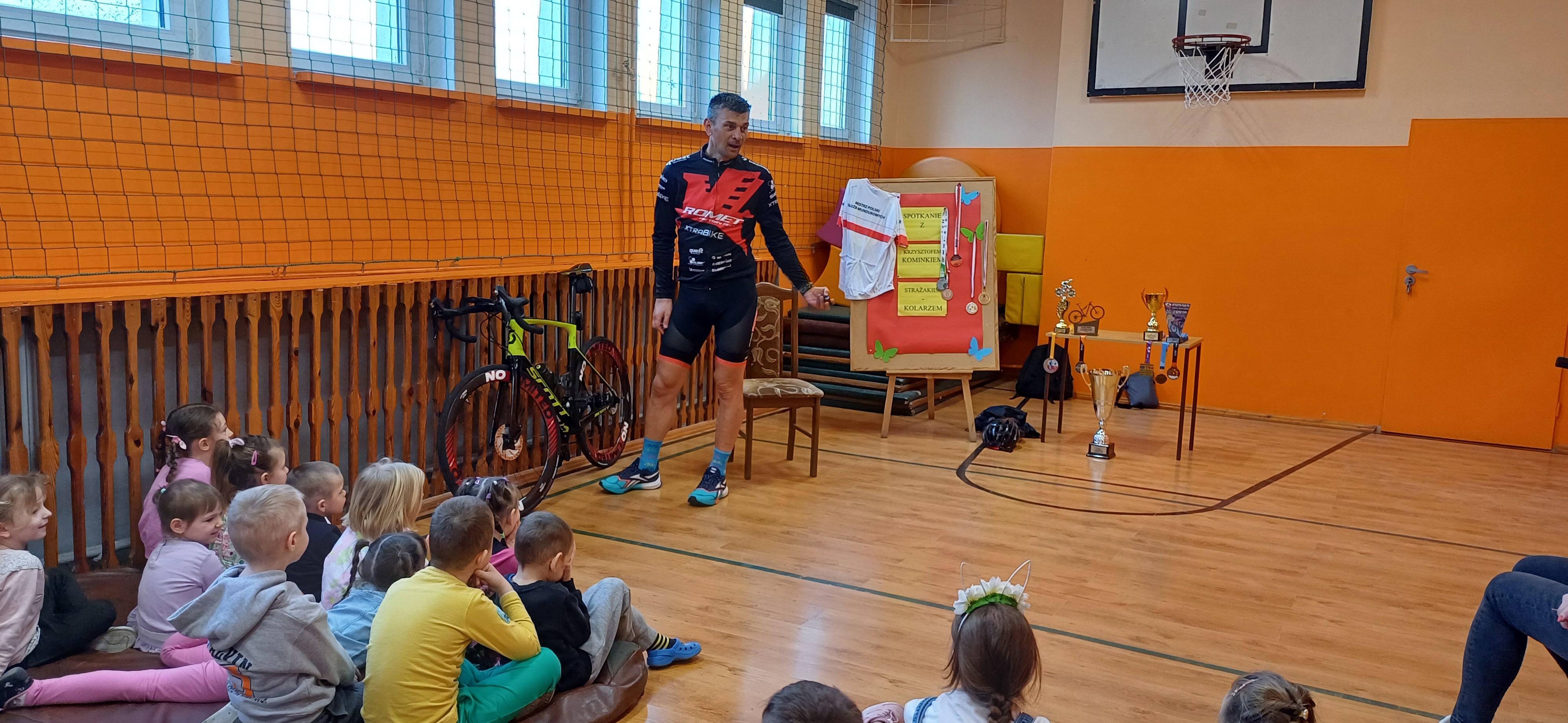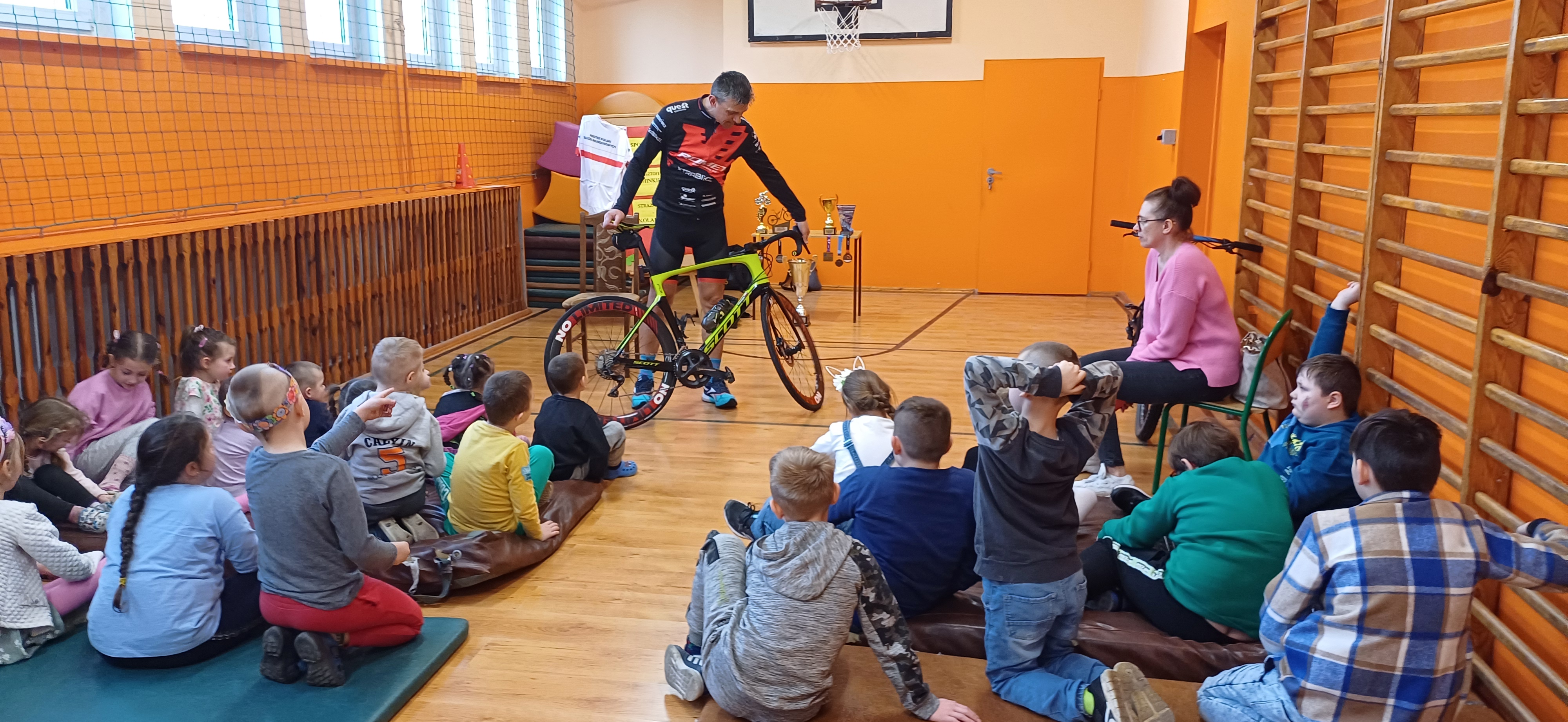 Podczas spotkania pan Krzysztof w sposób bardzo ciekawy i barwny opowiedział o swoich treningach, pasji, o zawodach w których uczestniczył w Polsce jak i poza granicami naszego kraju. Zaprezentował uczniom jak wyposażony jest jego rower, przypomniał o obowiązkowym wyposażeniu roweru i rowerzysty oraz o konieczności przestrzegania przepisów drogowych. Nasi uczniowie z wielkim zaciekawieniem słuchali wypowiedzi pana Krzysztofa, który zachęcał uczniów do aktywnego spędzania czasu wolnego z wykorzystaniem roweru. Po tym spotkaniu uczniowie, a zwłaszcza z klas I-II, które otrzymały rower w ramach projektu, ,,Rower dla pierwszaka” już szykują swoje rowery do wiosennych treningów pod okiem opiekunów.