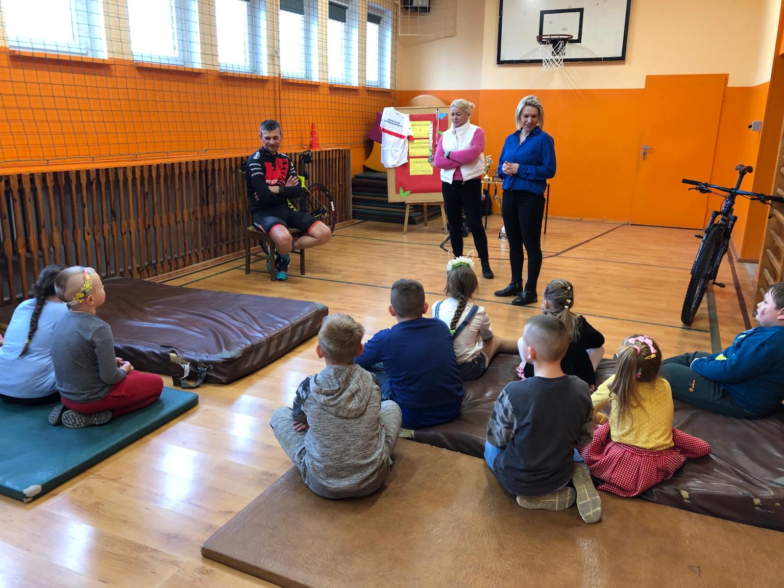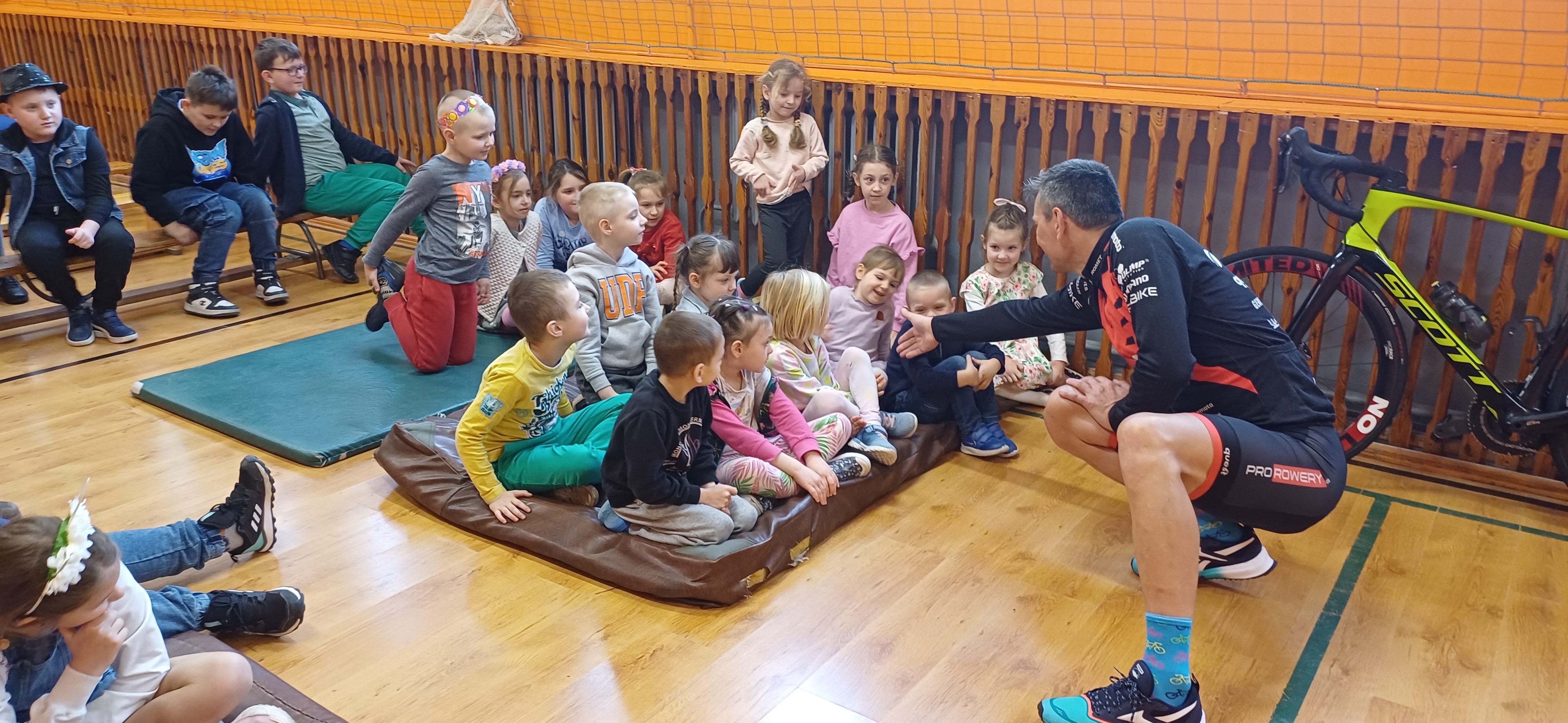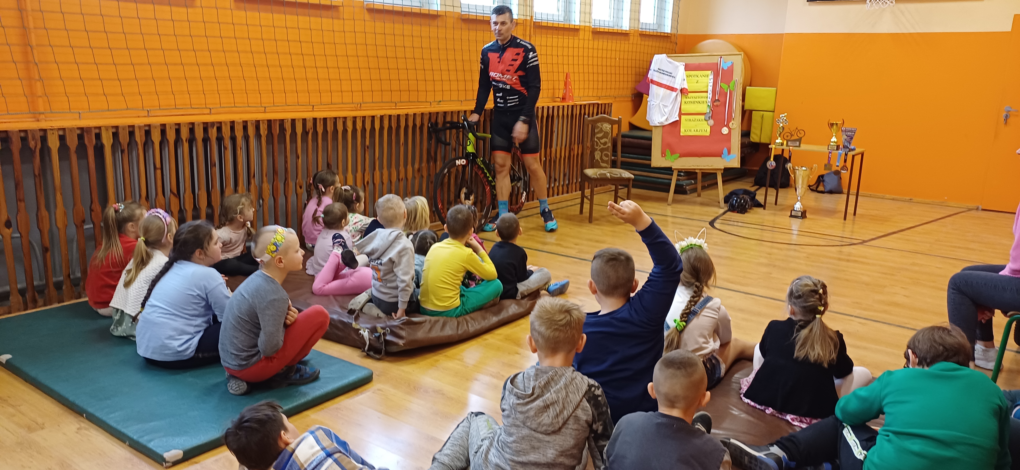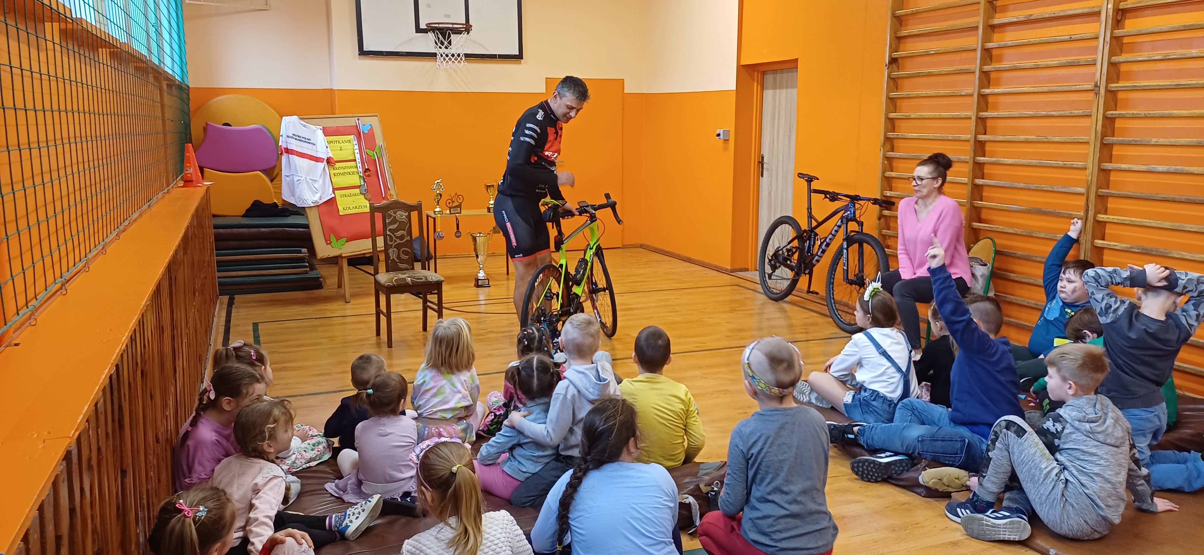 Podczas spotkania pan Krzysztof w sposób bardzo ciekawy i barwny opowiedział o swoich treningach, pasji, o zawodach w których uczestniczył w Polsce jak i poza granicami naszego kraju. Zaprezentował uczniom jak wyposażony jest jego rower, przypomniał o obowiązkowym wyposażeniu roweru i rowerzysty oraz o konieczności przestrzegania przepisów drogowych. Nasi uczniowie z wielkim zaciekawieniem słuchali wypowiedzi pana Krzysztofa, który zachęcał uczniów do aktywnego spędzania czasu wolnego z wykorzystaniem roweru. Po tym spotkaniu uczniowie, a zwłaszcza z klas I-II, które otrzymały rower w ramach projektu, ,,Rower dla pierwszaka” już szykują swoje rowery do wiosennych treningów pod okiem opiekunów.