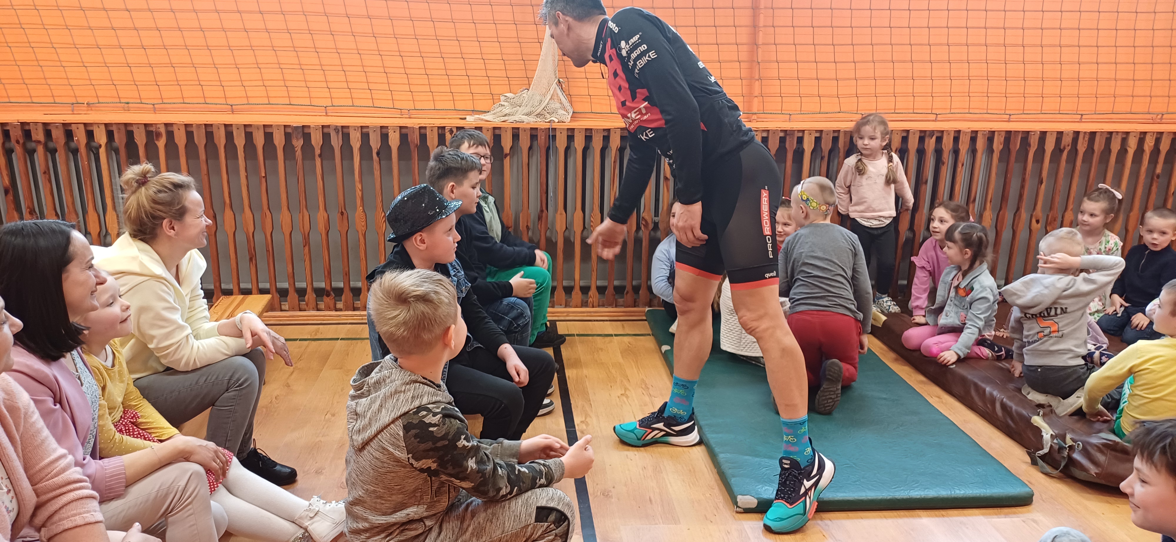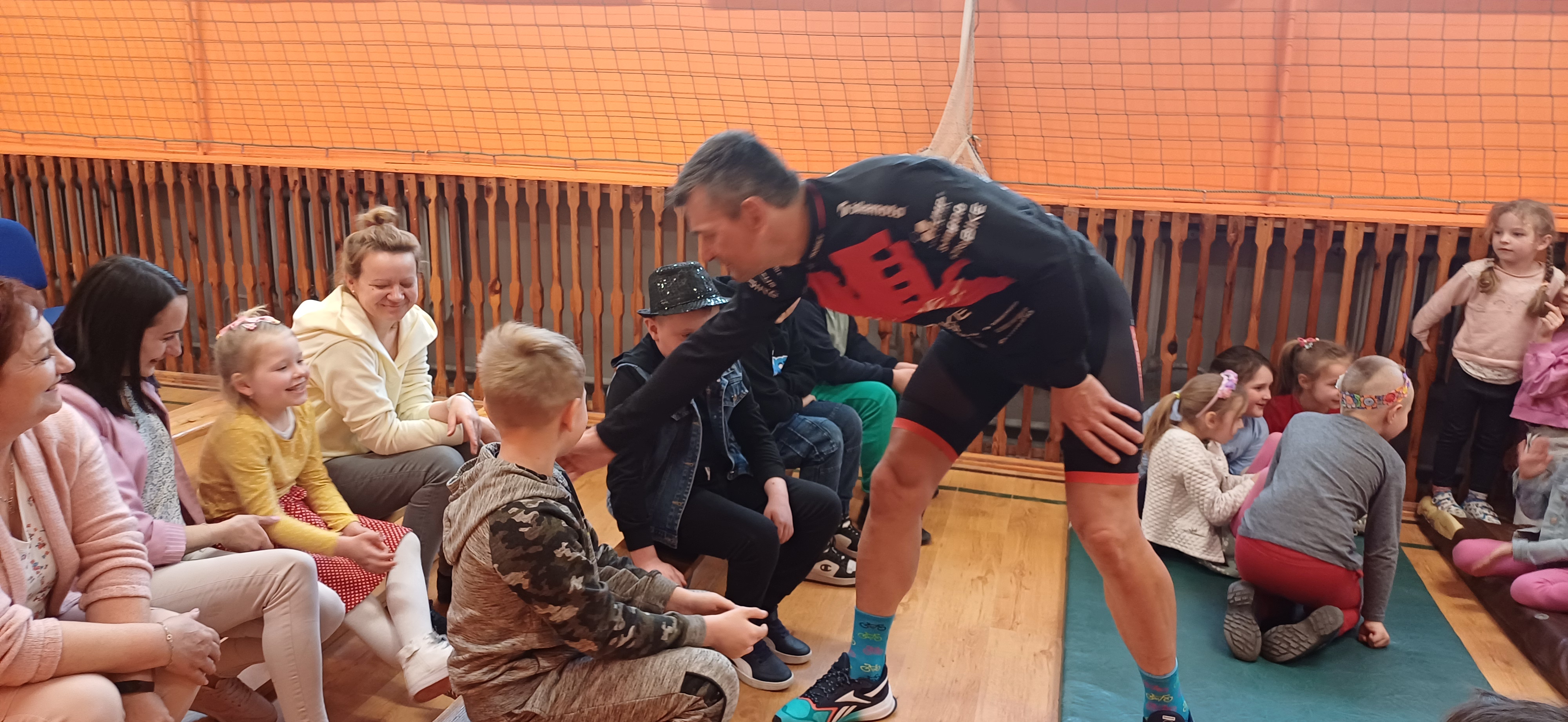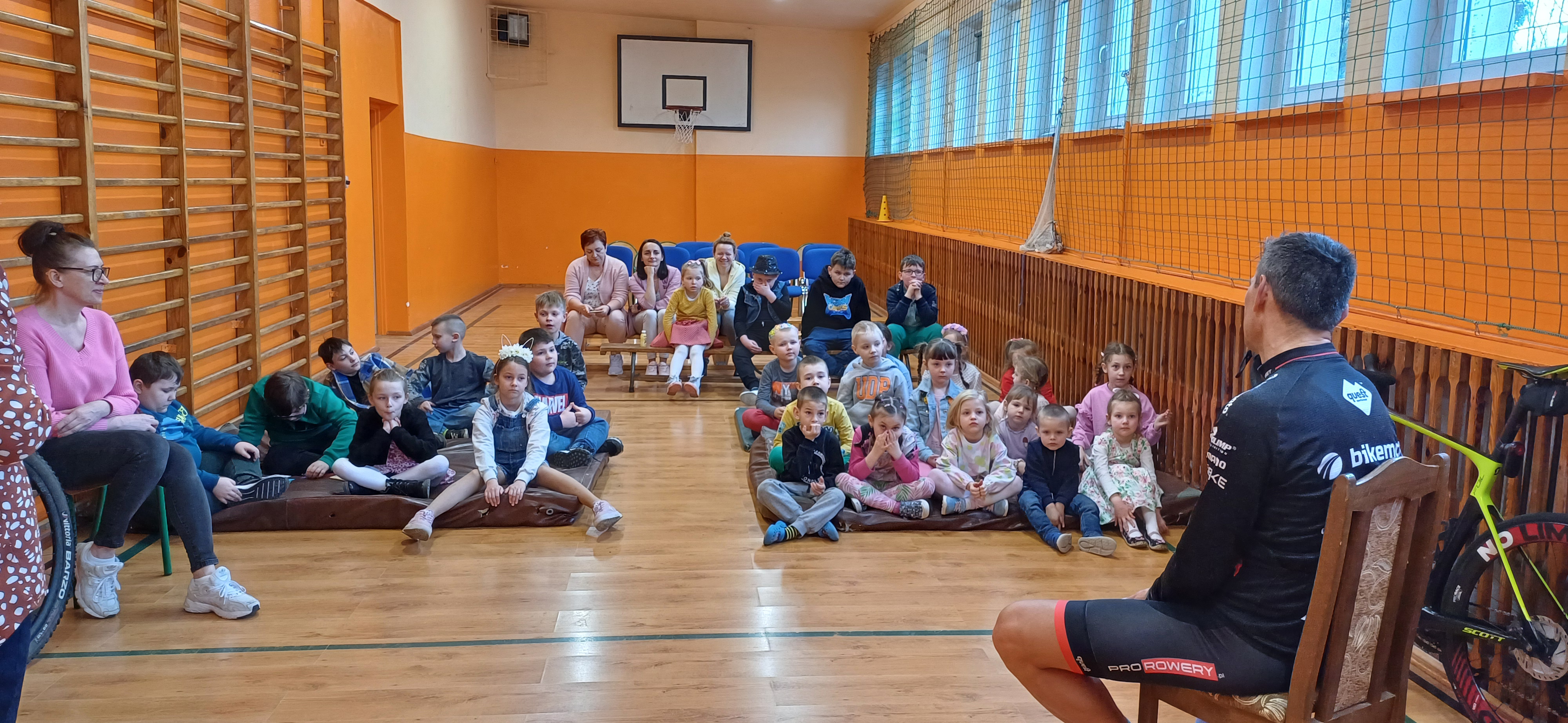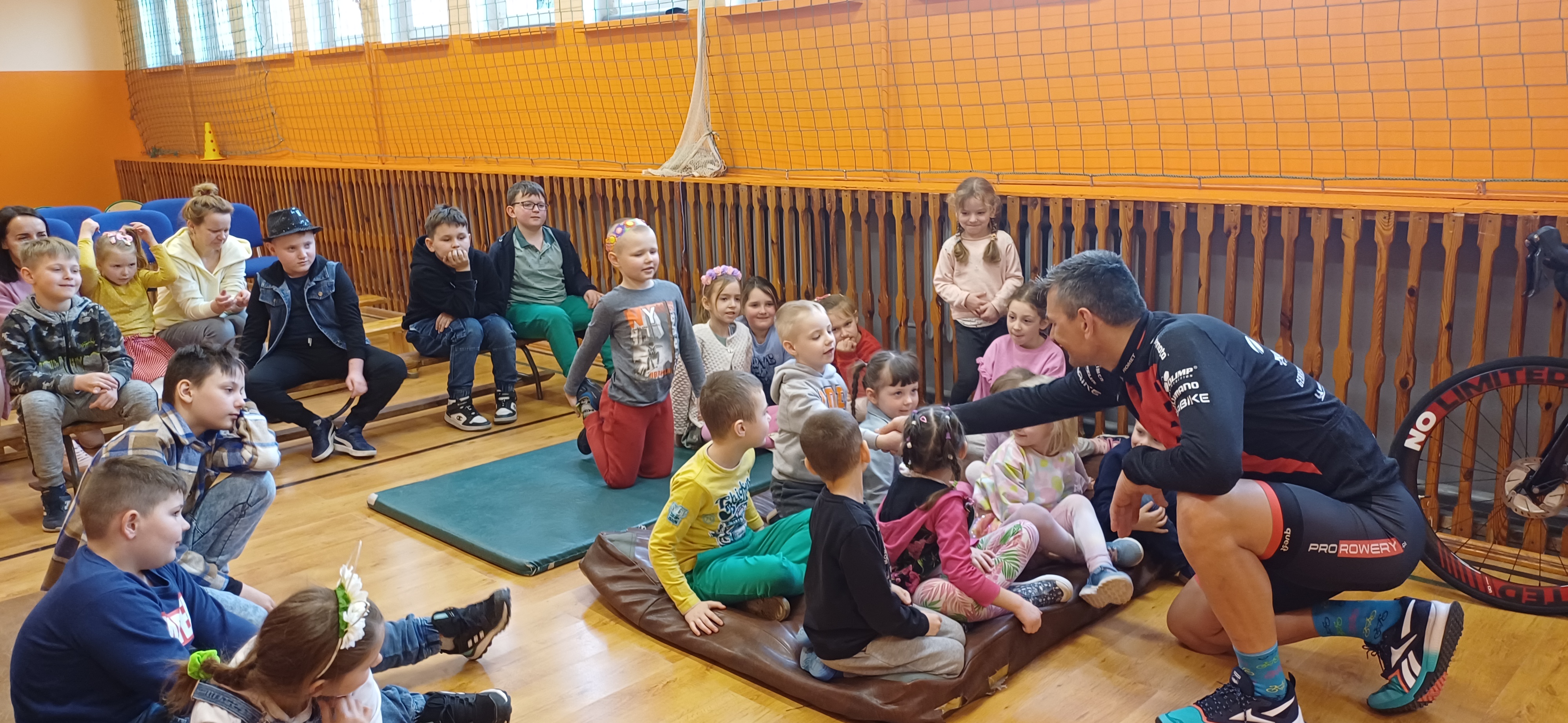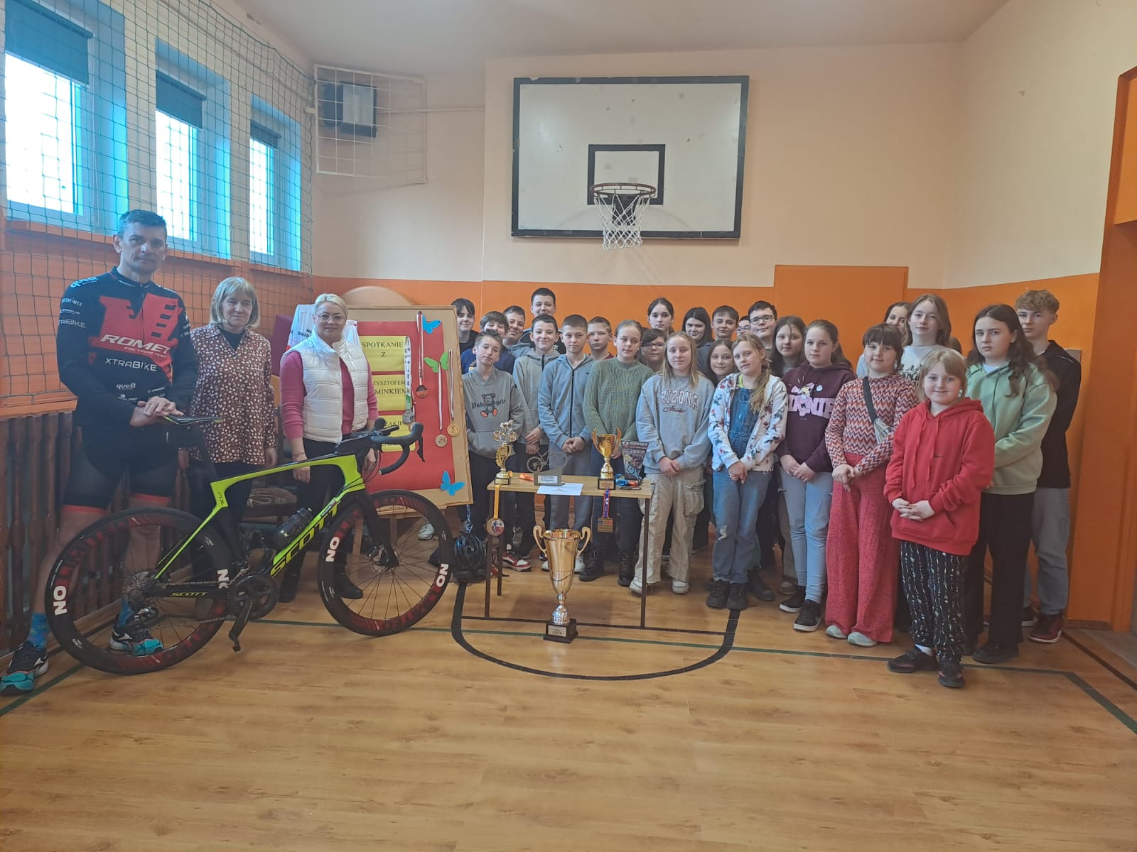 Podczas spotkania pan Krzysztof w sposób bardzo ciekawy i barwny opowiedział o swoich treningach, pasji, o zawodach w których uczestniczył w Polsce jak i poza granicami naszego kraju. Zaprezentował uczniom jak wyposażony jest jego rower, przypomniał o obowiązkowym wyposażeniu roweru i rowerzysty oraz o konieczności przestrzegania przepisów drogowych. Nasi uczniowie z wielkim zaciekawieniem słuchali wypowiedzi pana Krzysztofa, który zachęcał uczniów do aktywnego spędzania czasu wolnego z wykorzystaniem roweru. Po tym spotkaniu uczniowie, a zwłaszcza z klas I-II, które otrzymały rower w ramach projektu, ,,Rower dla pierwszaka” już szykują swoje rowery do wiosennych treningów pod okiem opiekunów.